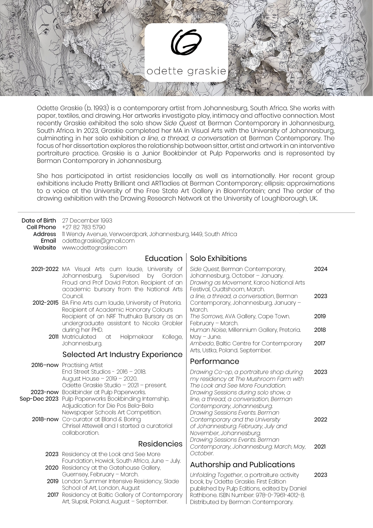 Odette Graskie (b. 1993) is a contemporary artist from Johannesburg, South Africa. She works with paper, artists’ books, and drawing. Her artworks investigate play, intimacy and affective connection. Most recently Graskie exhibited the solo show Side Quest at Berman Contemporary, as well as Drawing as Movement at the Klein Karoo National Arts Festival in Oudtshoorn, South Africa. In 2023, Graskie completed her MA in Visual Arts with the University of Johannesburg, culminating in her solo exhibition a line, a thread, a conversation at Berman Contemporary. The focus of her dissertation explores the relationship between sitter, artist and artwork in an interventive portraiture practice. Graskie is a Junior Bookbinder at Pulp Paperworks and is represented by Berman Contemporary in Johannesburg.