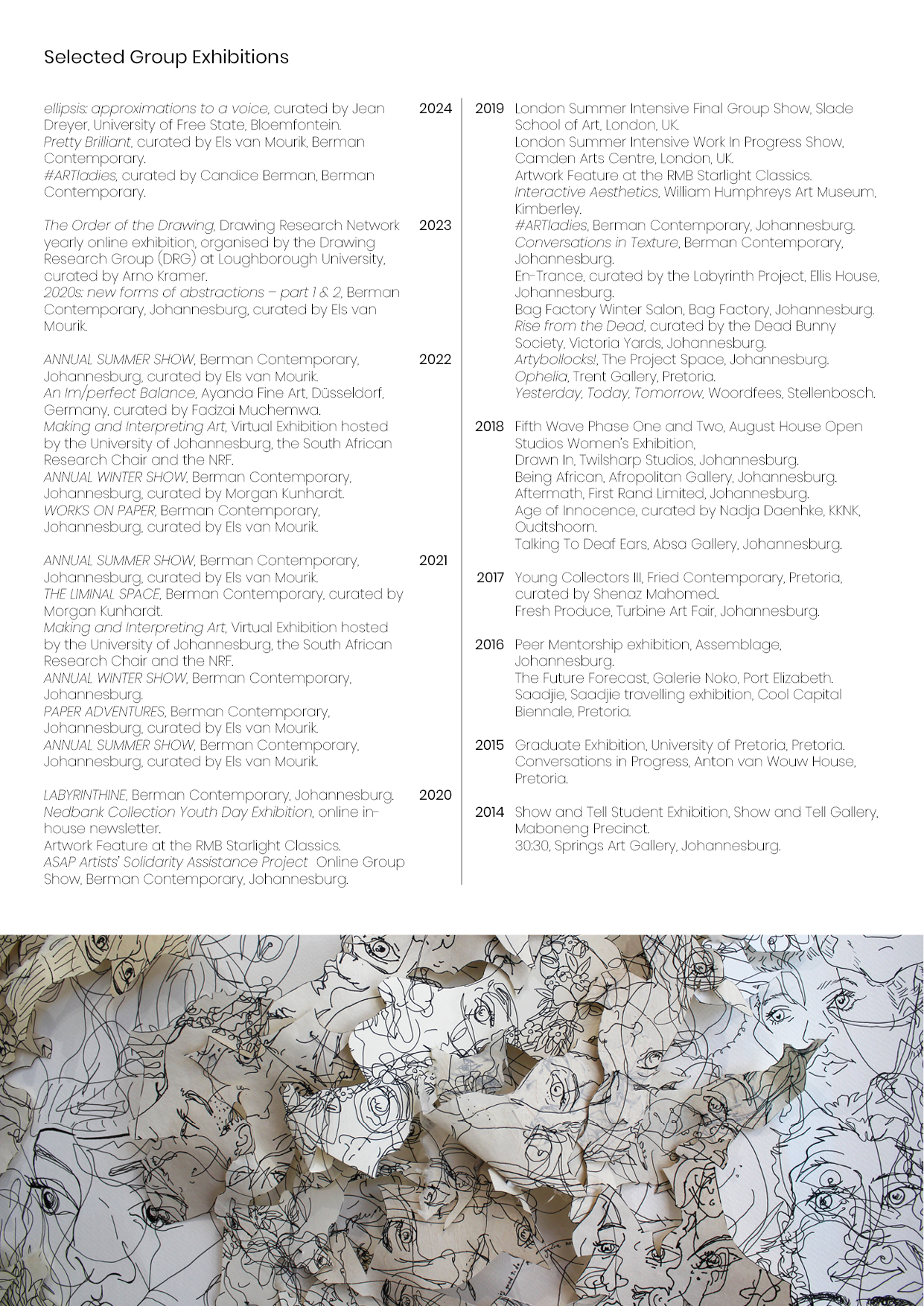 She has participated in artist residencies locally as well as internationally. Her recent group exhibitions include Pretty Brilliant and ARTladies at Berman Contemporary; ellipsis: approximations to a voice at the University of the Free State Art Gallery in Bloemfontein; and The order of the drawing exhibition with the Drawing Research Network at the University of Loughborough, UK. She took part in the 2022 1-54 Contemporary African Art Fair in London and the 2024 Investec Cape Town Art Fair.